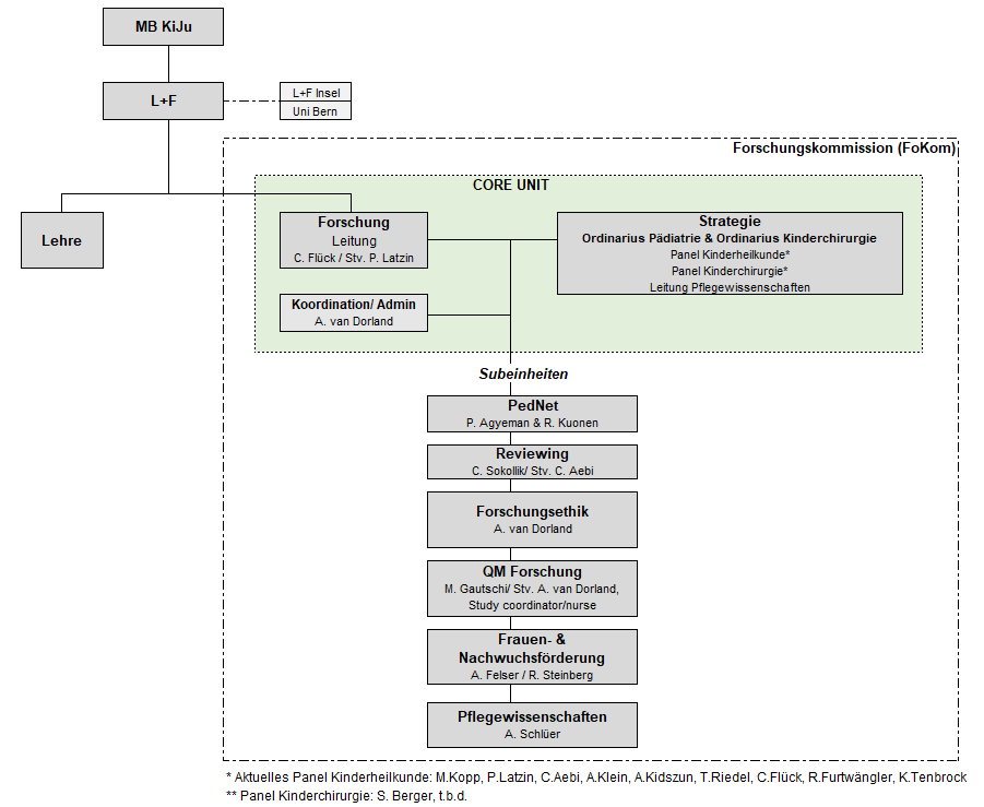Die CORE UNIT besteht aus einer Einheit für strategische Fragen, für welche die beiden Ordinarii für Pädiatrie resp. Kinderchirurgie verantwortlich sind. Entsprechend gibt es dort zwei Strategie Panels die die beide Fachgebiete Pädiatrie und Kinderchirurgie vertreten. Die Mitglieder der Panels werden durch die Ordinarii der jeweiligen Fachgebiete bestimmt.